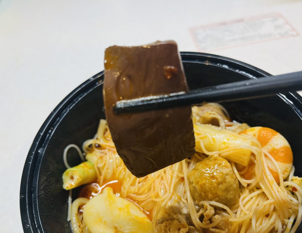 一見濃厚なチョコレートケーキのスライスにも見えますが、字の通りの鴨の血の豆腐です。こんにゃくの様に弾力があり、臭みもなく麻辣湯の具材にオススメです!
