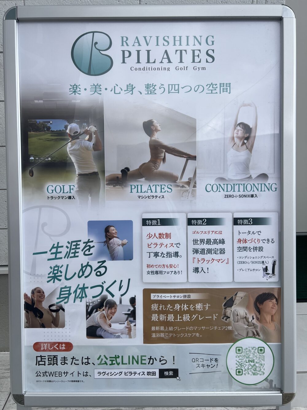 看板を確認すると、「ゴルフ」、「マシンピラティス」、「コンディショニング」などが体験できるそうです!