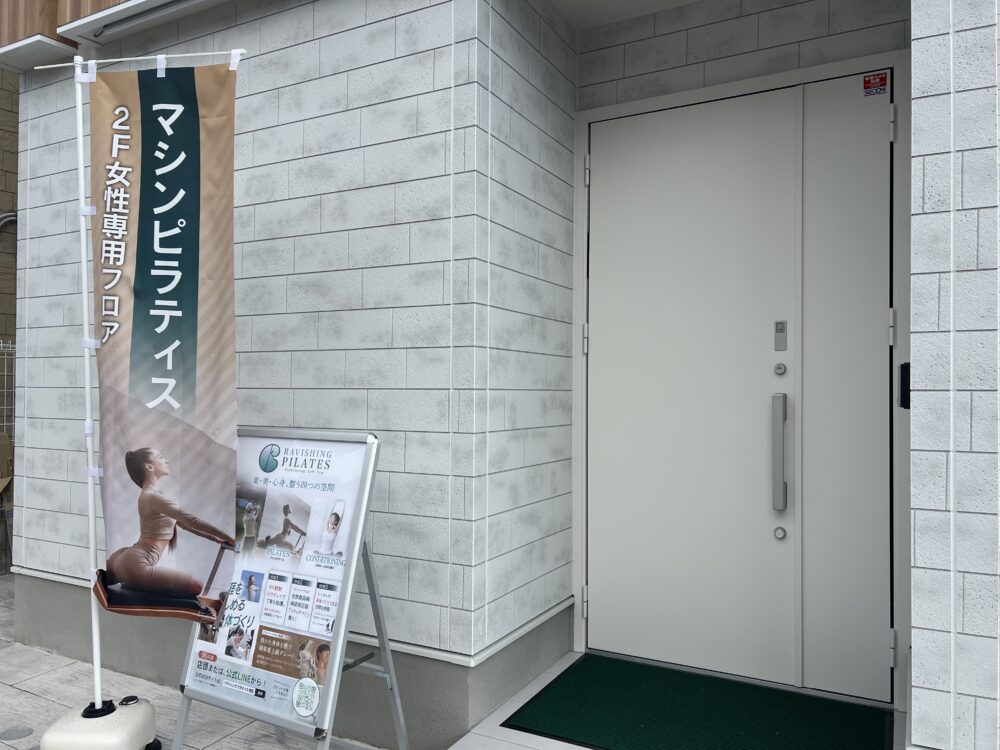 のぼりには、「マシンピラティス 2F女性フロア」と書いてあります。
