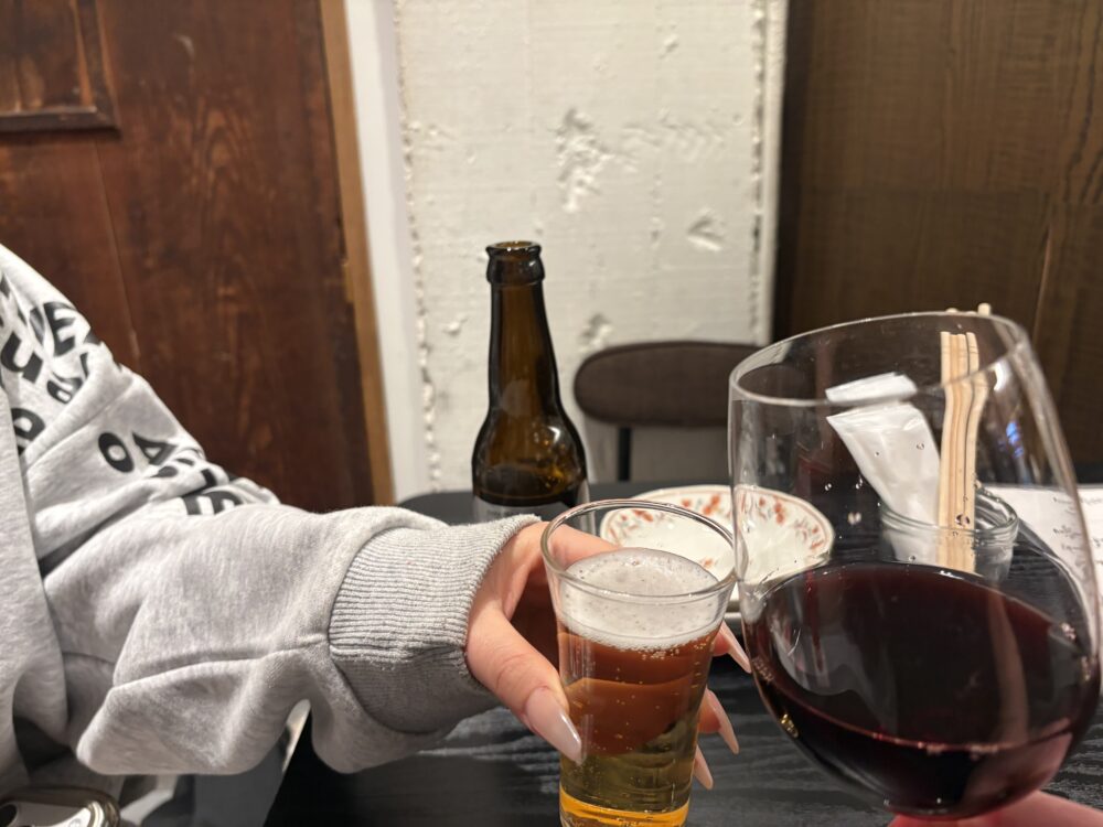 私はグラスワイン(赤)620円(税抜)。娘は小瓶のスーパードライ680円(税抜)でかんぱーい!!