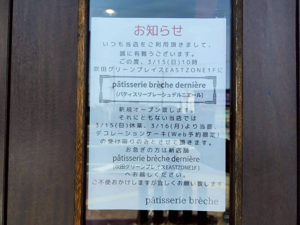 【3月15日 吹田グリーンプレイスに新店オープン!】ユニークで本格派のケーキ屋「bréche dernière(ブレーシュ デルニエール)」@片山町