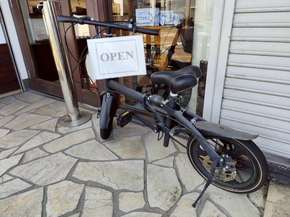 入り口には「OPEN」という札がかかった小さな自転車が置かれています。