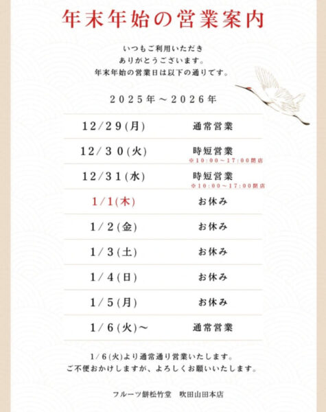 フルーツ餅松竹堂(フルーツ餅@山田東)の年末年始の営業案内です。