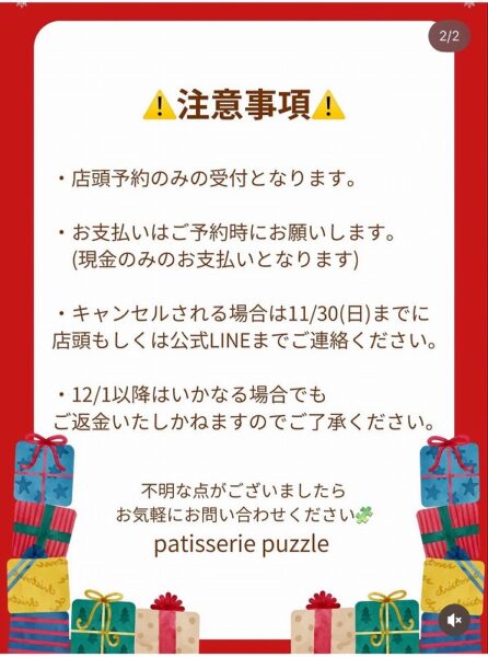 patisserie.puzzle(お菓子屋@岸部北)ではクリスマスケーキの予約がスタートしています。