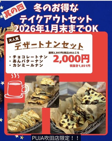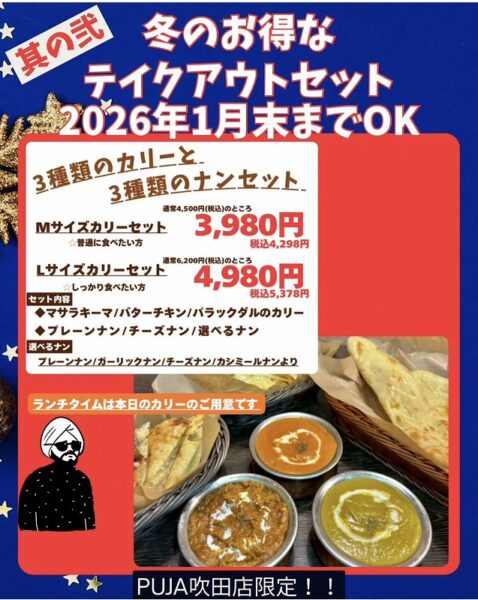 PUJA吹田(カレー屋・山田南)の『冬のお得なテイクアウトセット』をご紹介します♪