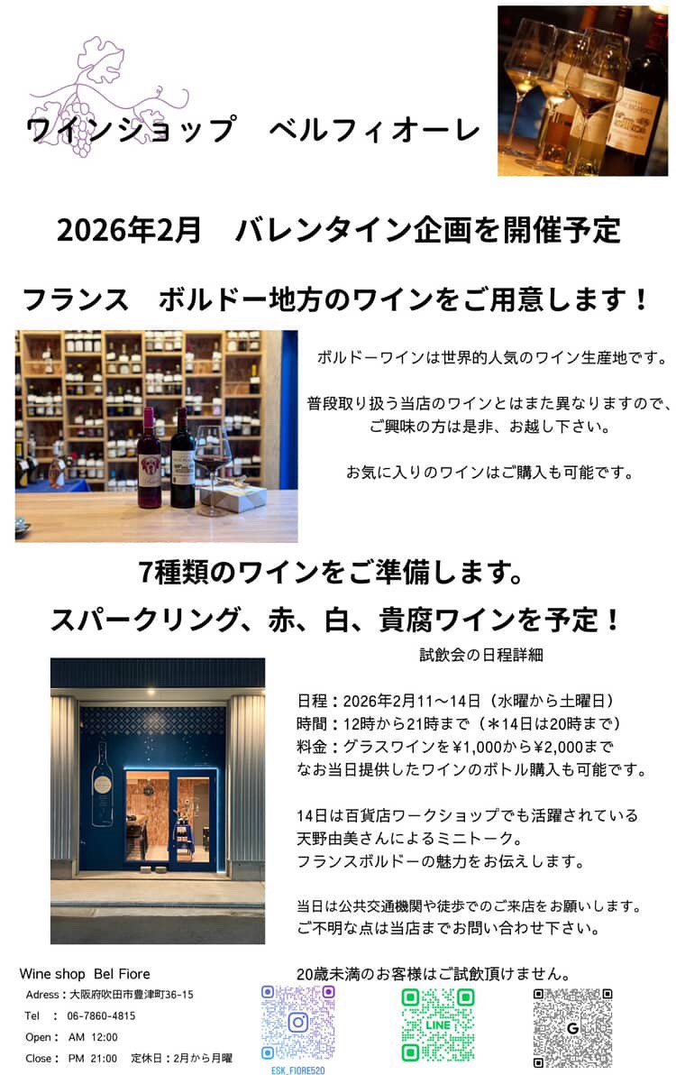 ワインショップ ベルフィオーレ(ワインショップ@豊津町)で行われるバレンタインイベントのお知らせです。