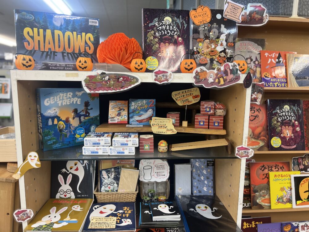 現在はハロウィン関連の絵本やボードゲームが展開されています。