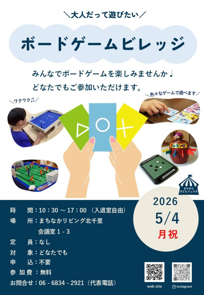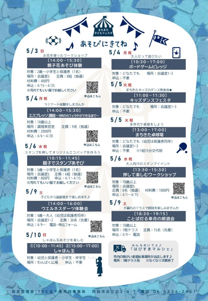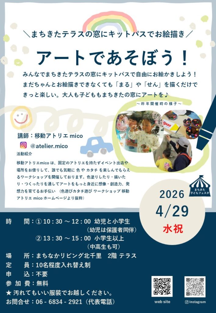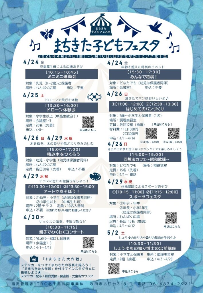 北千里にある、児童センター・図書館・公民館の複合施設である「まちなかリビング」にて、4/24(金)~5/10(日) 「まちきた子どもフェスタ2026」が開催されるようです!