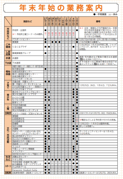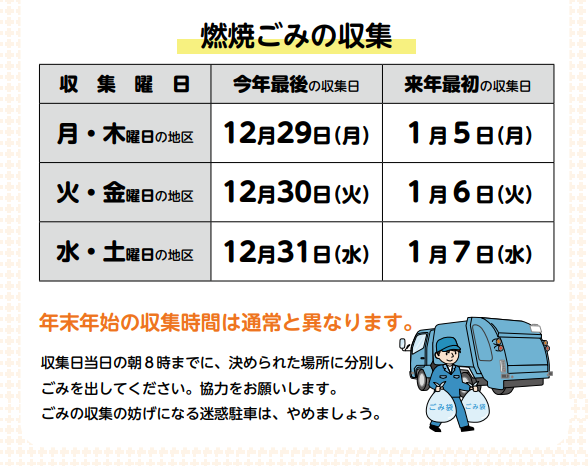 年末は収集曜日ごとに12月29日(月)~31日(水)まで、年始は1月5日(月)から、通常どおり収集されます。