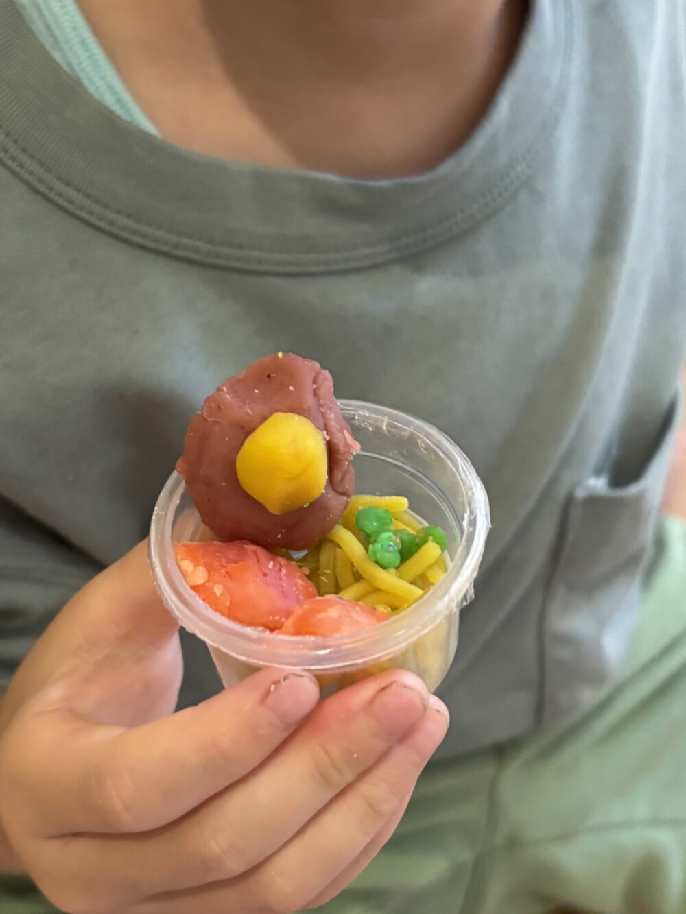 ※5才息子作の「粘土ラーメン」...チャーシュー、ゆで卵、ねぎ乗せ、らしいです。トッピングにもめっちゃ力入れている系の店ですね!笑