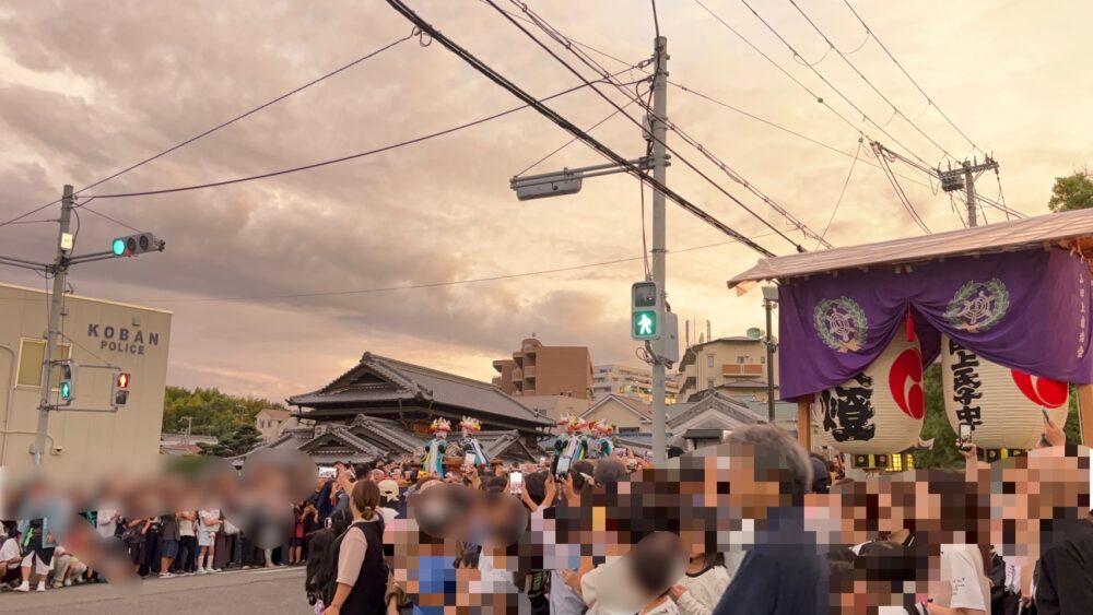 神社前の交差点で行われてた「打ち込み太鼓」と「交差点練り」を!人の多さにびっくり〜