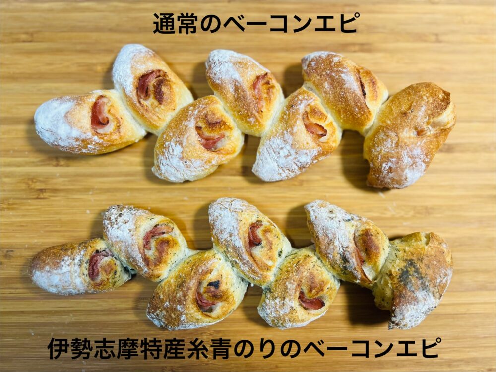 今回は、通常のベーコンエピと新商品の「伊勢志摩特産糸青のりのベーコンエピ(税抜250円)」を食べ比べてみることにしました。