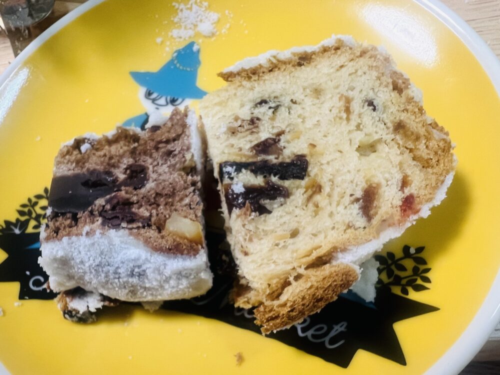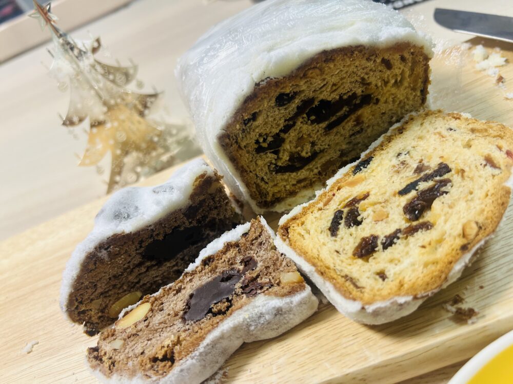 特製シュトーレンのハーフサイズと生チョコシュトーレンの1/4カットをテイクアウトで自宅に持ち帰り、さっそく実食。