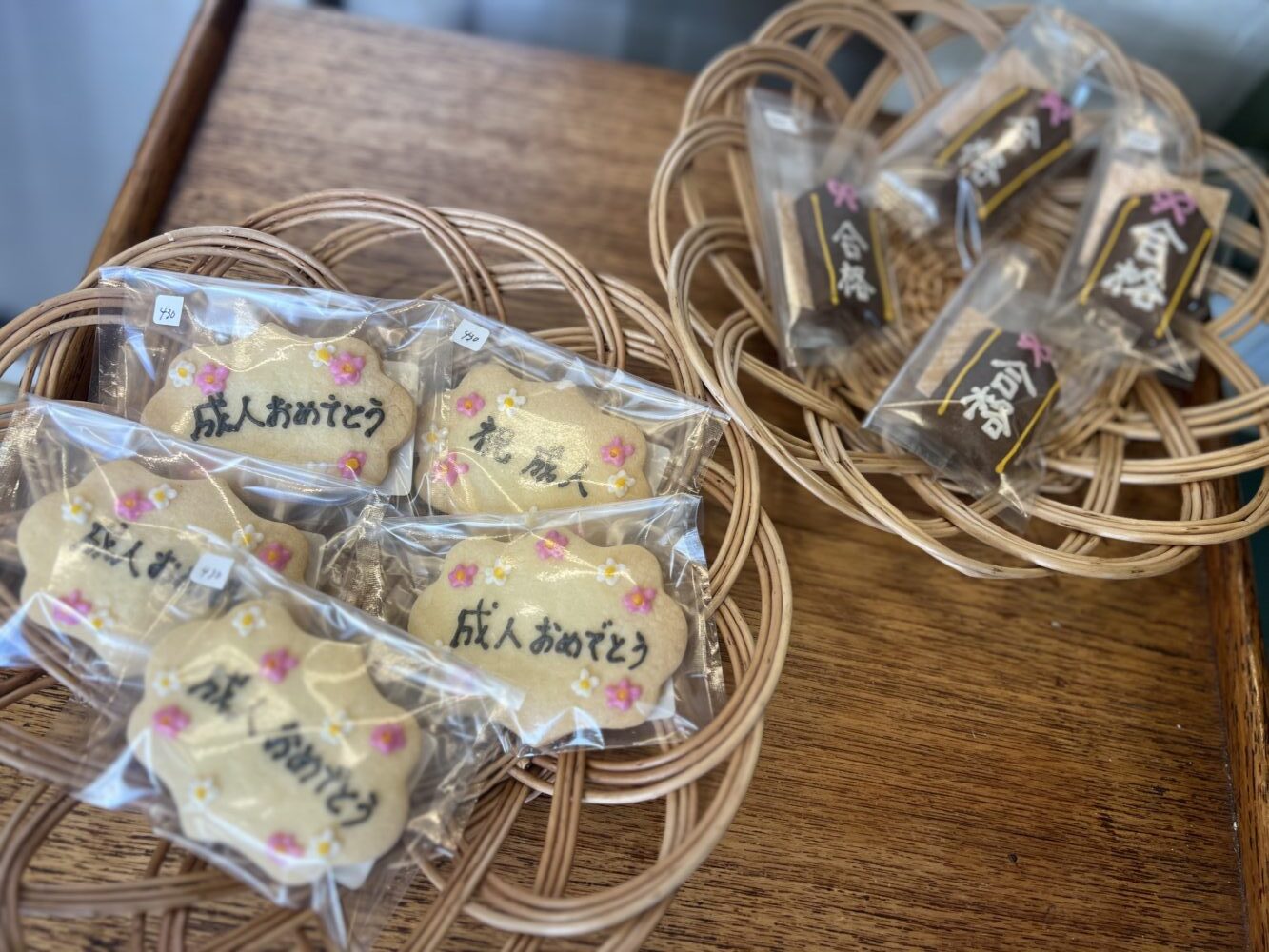 「成人おめでとう」というメッセージ入りのアイシングクッキーは、新成人の方への贈り物に喜ばれそうですね♪