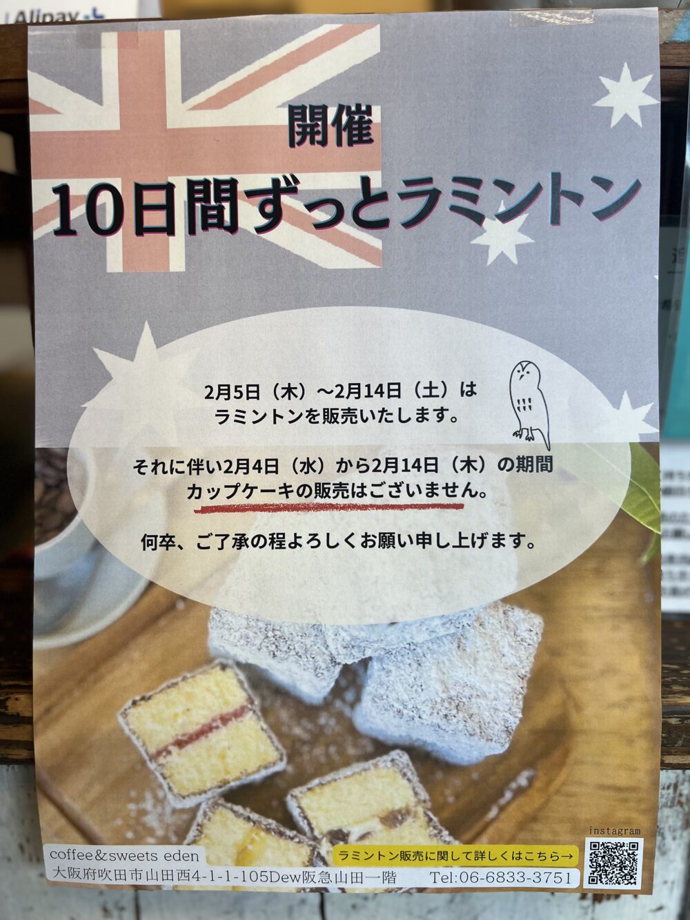 2月5日〜2月14日、「10日間ずっとラミントン」が開催されたら、また「ラミントン」を買いに「eden」に行きたいと思います♪