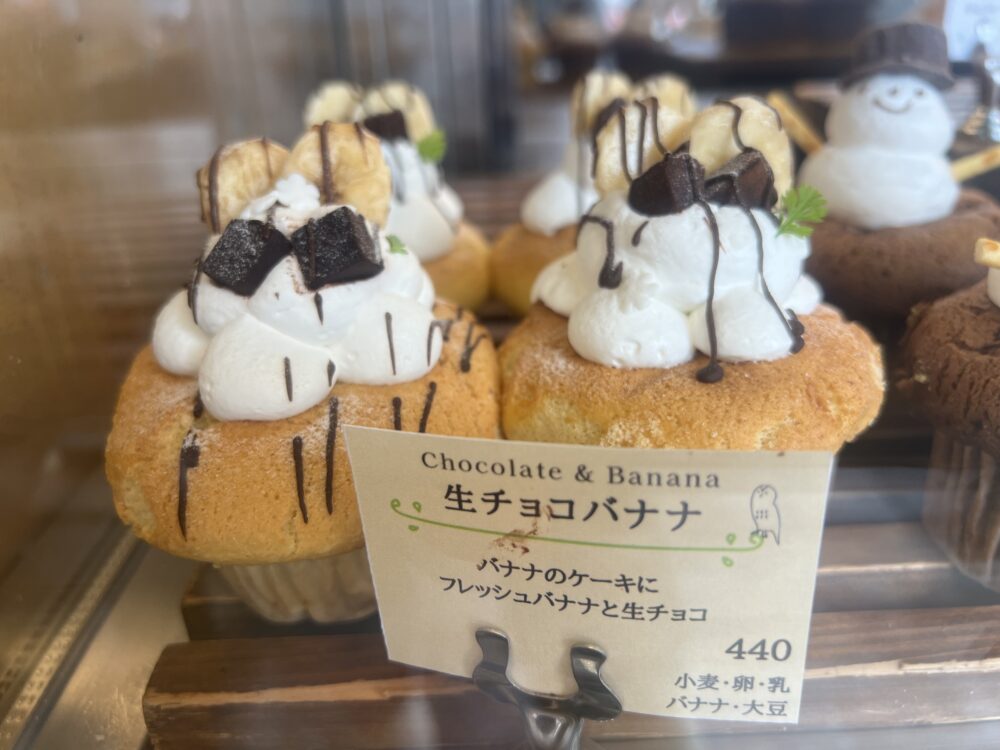 バナナのケーキにフレッシュバナナと生チョコがトッピングされた「生チョコバナナ(税込440円)」。