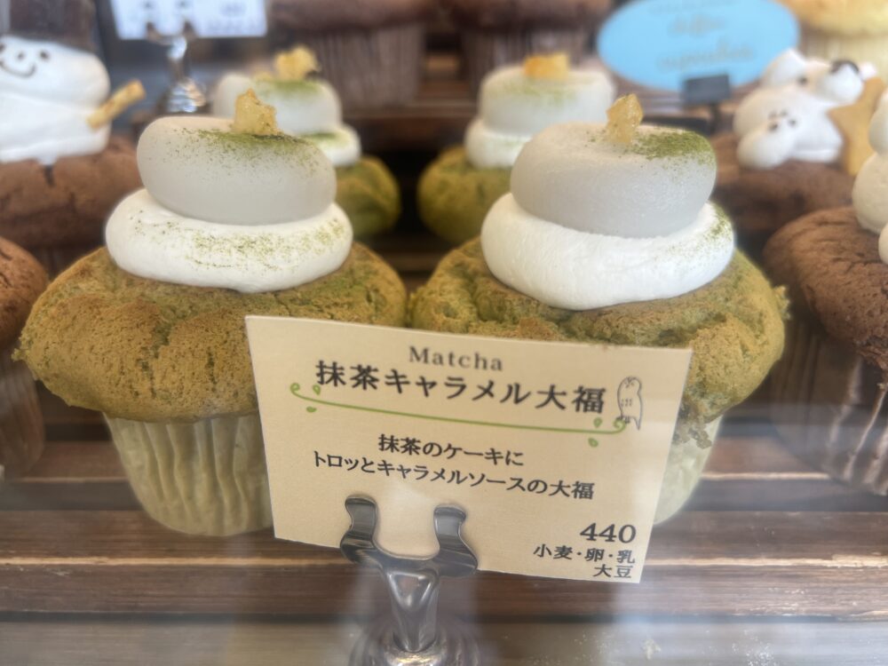 抹茶ケーキにキャラメルソースの大福がのった「抹茶キャラメル大福(税込440円 」。